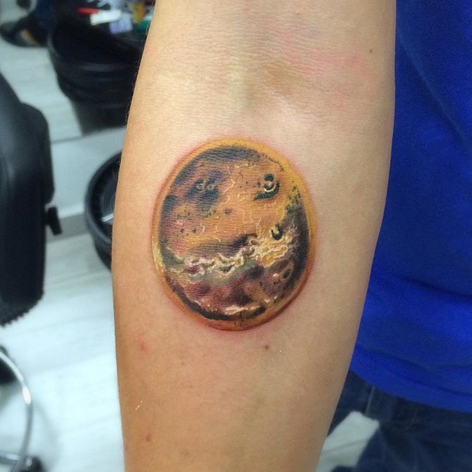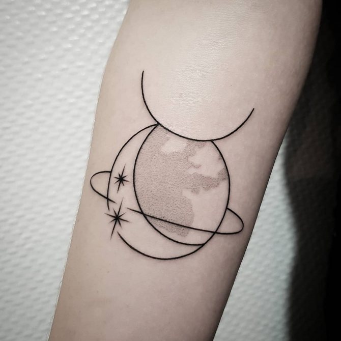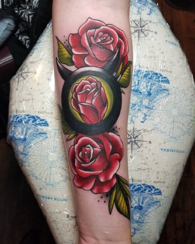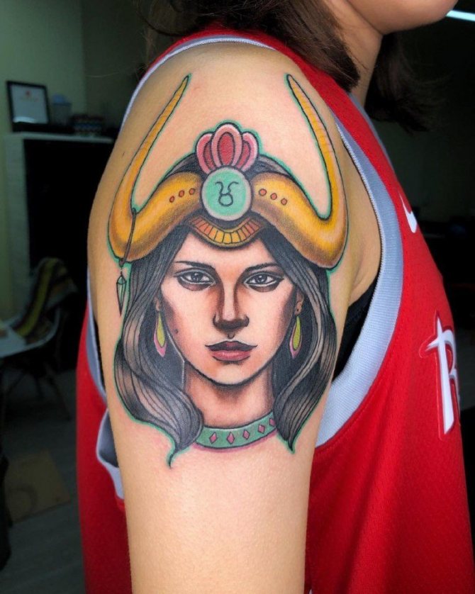 Il patrocinio di Venere dota il Toro di qualità come la gentilezza, la delicatezza, la compassione e l'amore per tutte le cose belle. D'altra parte, è emotivo, il che può portare a uno scoppio di emozioni incontrollabili. Per questo motivo, molte persone preferiscono avere un'immagine del pianeta protettore dipinta sul loro corpo, o completare il motivo principale del disegno con un tale dettaglio. Venere può decorare armoniosamente la parte interna della mano, il polso, la scapola o la clavicola.