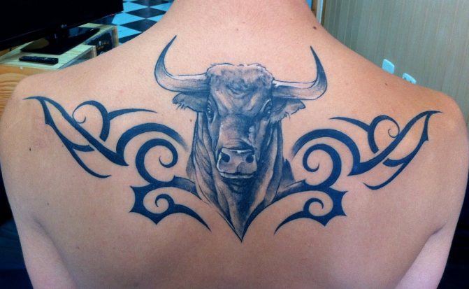 Gli uomini scelgono occasionalmente dei motivi monocromatici a forma di toro realizzati con legature runiche o ornamenti etnici, in particolare polinesiani, dimostrando così un desiderio di scoperta di sé e un omaggio ai loro antichi antenati. Le trame che enfatizzano il legame dell'uomo con le sue origini e la fede nella forza e nel potere naturale includono la rappresentazione astrologica del Toro, presumibilmente scolpito nella pietra.. Un tale tatuaggio è considerato un amuleto che garantisce al suo proprietario il sostegno dell'elemento terra.
