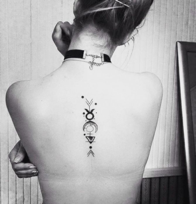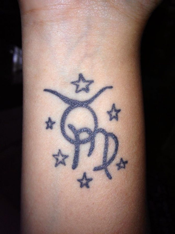 Le iscrizioni del tatuaggio fatte in stile zodiacale non sono di grandi dimensioni, ma hanno sempre un significato nascosto conosciuto solo dall'autore del disegno e dal proprietario del tatuaggio. Nella maggior parte delle varianti, il significato è il nome del segno zodiacale 'Taurus' o la data di nascita in numeri romani. Il tatuaggio viene applicato su qualsiasi parte del corpo, permettendo di nascondere abilmente il disegno sotto i vestiti, e viene completato con vari dettagli tematici.