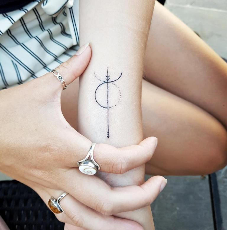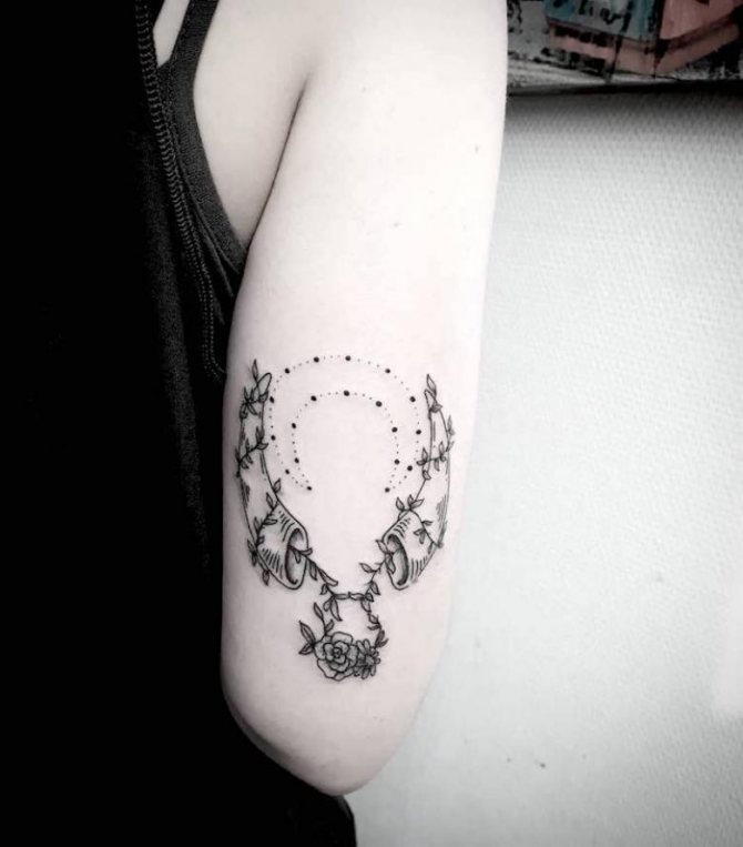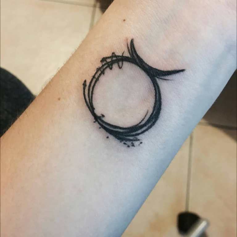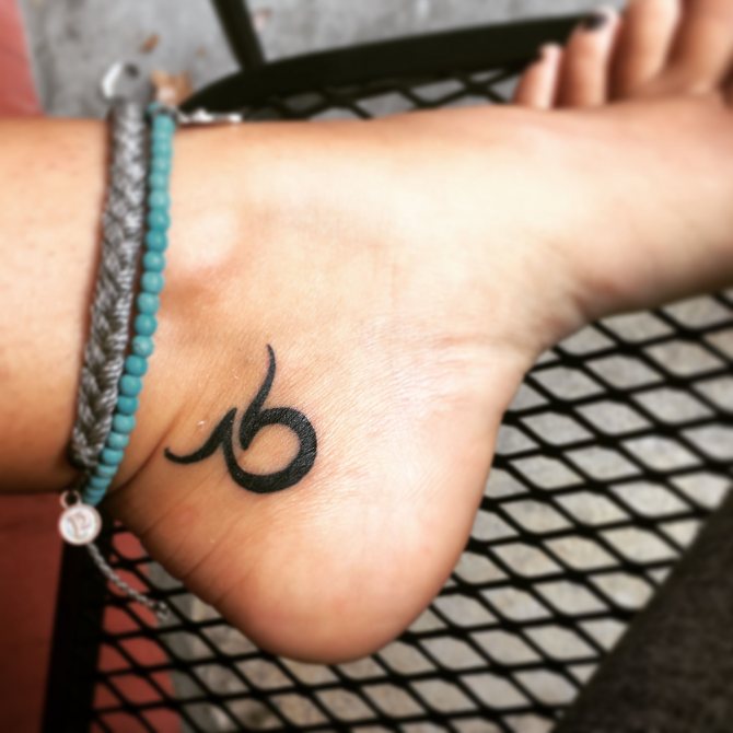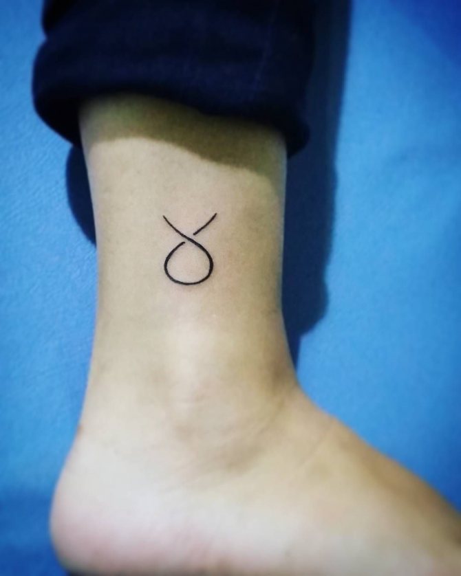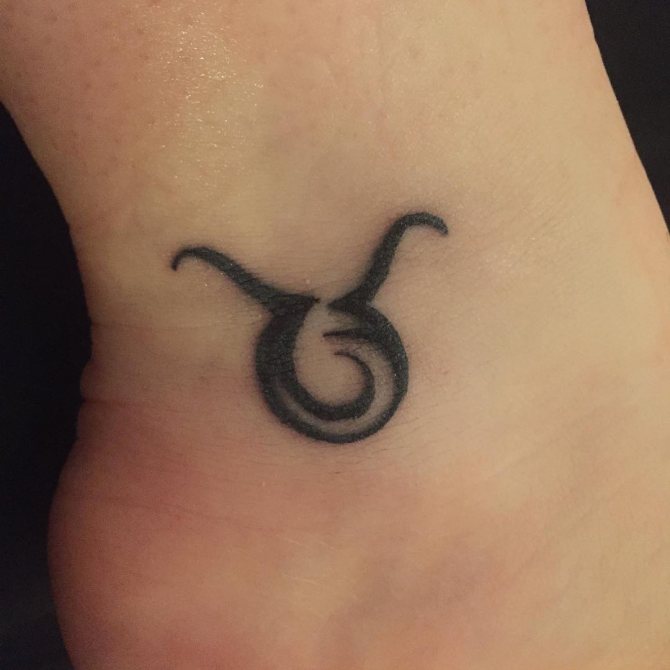 Questa immagine è considerata la più semplice e consiste in un cerchio, uno o due semicerchi situati in alto e che assomigliano alla silhouette delle corna dell'animale. Questo tatuaggio sarà ideale per i fan del minimalismo e, nonostante la sua natura "non sofisticata", può essere eseguito in varie tecniche e completato da modelli, linee, sfondi colorati e altri dettagli. Il disegno con il segno decorerà armoniosamente il tuo polso, il piede, la clavicola o il collo.