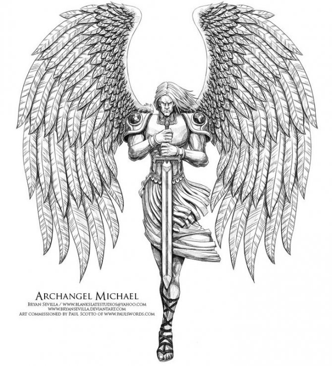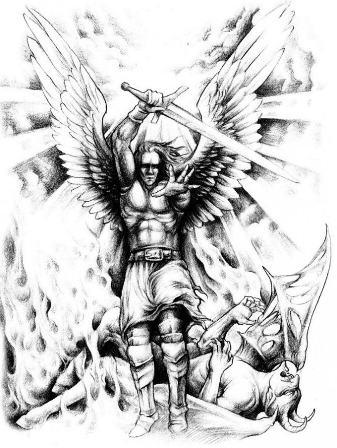 Ali di un arcangelo Gli arcangeli sono in cima alla gerarchia degli angeli. Accanto a Dio, sono gli esseri spirituali e intellettuali più potenti. Una delle ragioni per cui i religiosi preferiscono questa immagine è perché credono che il potere spirituale degli arcangeli possa influenzarli. Le ali, oltre a cui uno scudo e una spada sono raffigurati - una costante disponibilità a combattere il male.