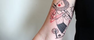 この部分は、男性の場合、もう少しわかりやすい選択肢があります。すべて同じ碑文(ロシア語、英語、ラテン語)と象徴的な出来事の日付があれば、かっこよく見えると思います。幾何学的なスケッチも有効です。タヌキやフクロウ、シカなど、動物のラインワークデザインが今、流行しているんです。袖の続きであれば、柄のスタイルが合っていることがとても重要です。この点については、「男性のためのスリーブタトゥー」という記事で詳しく紹介しました。