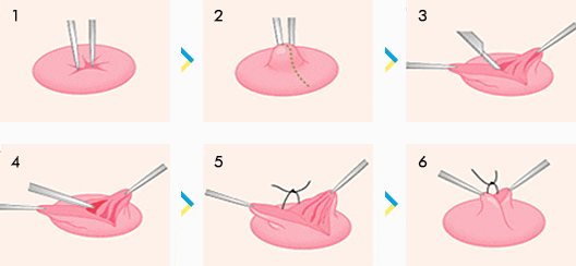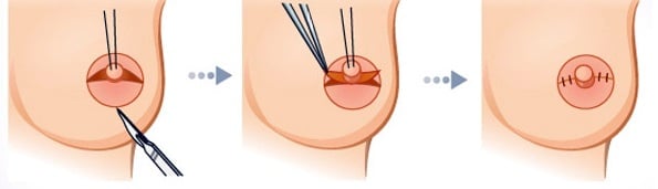手術の方法は、患者さんが妊娠を計画しているかどうかによって異なります。 妊娠を計画している場合は乳管全体を残し、計画していない場合は乳管を切り離します。最終的な結果に大きな差はありませんが、乳管を温存すると乳首の陥没が再発することがあるので注意が必要です(リスクは非常に低いのですが)。