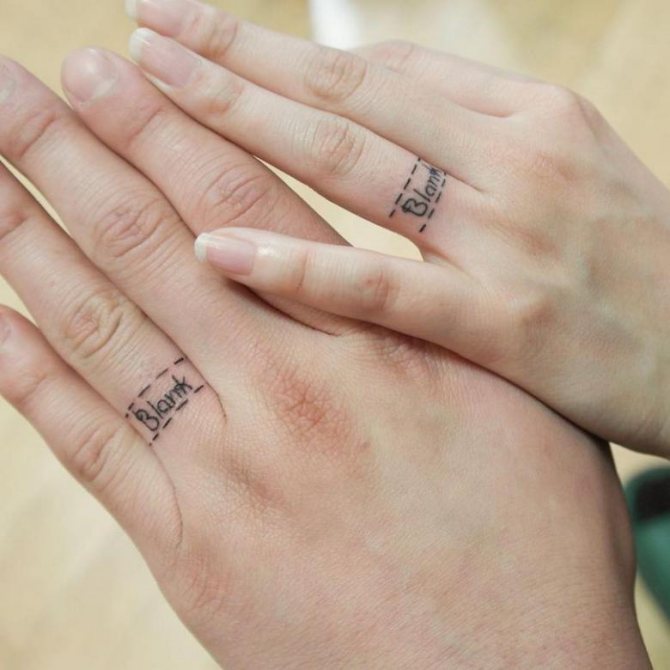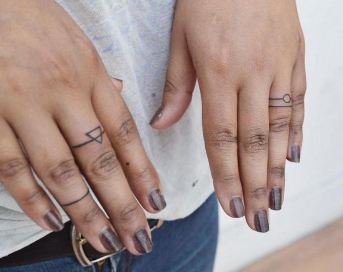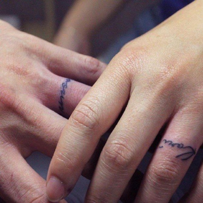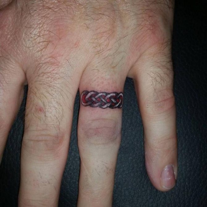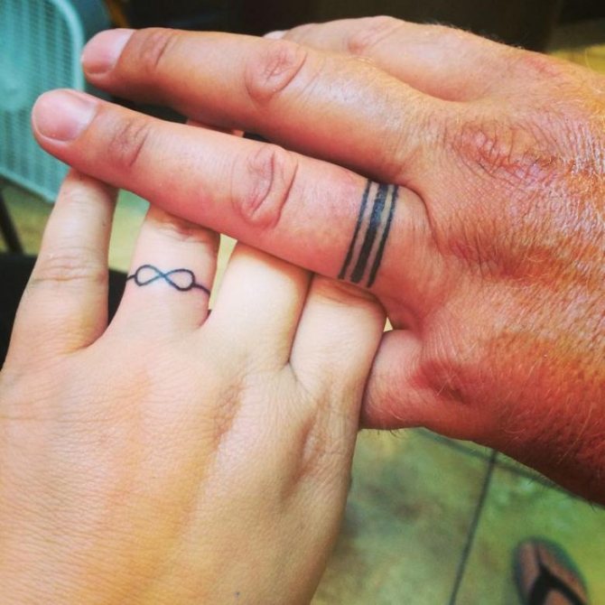 スケッチの意味は、シンプルで単純な場合もあるが、多くの場合、秘密の、個人的な意味を含んでいる。それは、タトゥー・リングの持ち主だけが明らかにすることができます。多くの場合、結婚後の愛と約束の証として、パートナーの手に複製されるエンゲージ・シンボルです。男は愛のために多くのことをすることをいとわず、選んだ相手には忠実で、自分の選択を示したいと思っている。