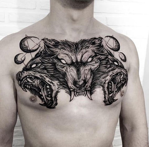 胸にケルベロスの刺青