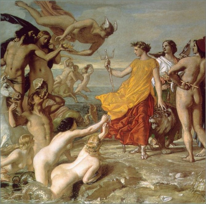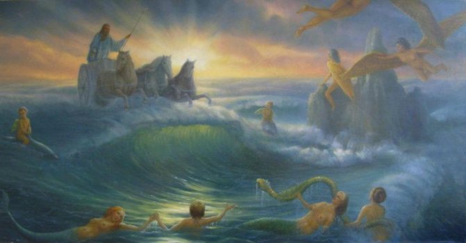 彼は未来の秘密をすべて知っている。ネレウスは嘘や偽りを知らず、神々と人間に啓示する真実のみを知っています。ネレウスには50人の美しい娘がいたが、最も美しいのはアンフィトリテであった。ある日、ポセイドンは若いアンフィトリテが寄せてくる波と陽気に遊んでいるのを見て、彼女に心を奪われました。しかし、彼女は海神の恐ろしい姿に怯え、世界の果て、タイタン・アトランタスが肩に乗せた天の金庫がある場所まで逃げ出した。ポセイドンはネレウスの美しい娘を長い間探していましたが、イルカがアンフィトリテの避難場所を教えてくれました。アンフィトリテは世界の果てにさえ隠れることができなかった。海王はネレイドを抱き上げると、空を飛ぶことができる4頭の雪のように白い馬が引く馬車で、エメラルドグリーンの宮殿へと急いだのです。