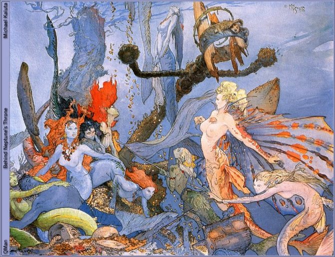 プロティウスは無作法で無愛想で、誰かを助けたとしても、それは自分が望んだ時だけだった。それなのに、人々は彼を神として崇めた。なぜなら、彼は未来に起こることをすべて知っていたからだ。毎日正午になると、プロテウスは海の底を離れ、海岸にある洞窟で昼寝をするのだ。そうすれば、彼は捕まるかもしれない。しかし、プロテウスはライオンや蛇に姿を変え、水中を泳ぎ、火のように燃え、木になり、岩になることができたのですから、相当な力と勇気が必要でした。プロテウスを強く抱いて、どんどんギュッと抱きしめ、何も怖がらないことが必要だったのです。プロテウスはその力を使い果たしたとき、しぶしぶ未来を予言したり、良いアドバイスをすることを承諾した。だからこそ、彼は人々から尊敬されたのです。海が穏やかで、雲ひとつない青い水平線が見えると、漁師の神様であるグラヴカが見える。彼はかつて人であった。ある日、海辺を歩いていると、波が岸に投げた魚が新しい力を得て、また海に帰っていくのに気づいた。グラブクは、海岸に生えている草には何か奇跡的な性質があるのではと推測した。彼は草の束を拾い、それを噛んで、海に身を投げて永遠にそこにいたいという圧倒的な欲求に駆られた。波は彼を優しく包み込み、グラヴクは漁師や船乗りたちの神となった。海を渡ったグラヴカは、ふさわしい妃を探し、海魔フォルキアスの娘で美しいニンフ、スキュラを選びました。しかし、スキュラはグラウコスの愛情に応えようとしなかった。