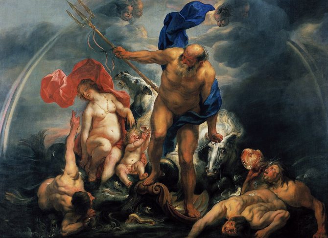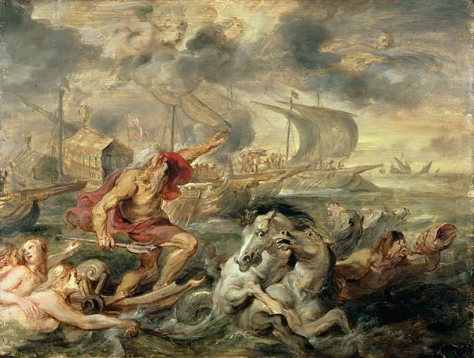 ゼウスは大地の支配者、ポセイドンは海の支配者、ハデスは冥界の王と、兄弟は世界の支配権を分け合った。ポセイドン(ローマ人はネプチューンと呼んだ)以前は、海や川や小さな水域の支配者はオセアヌスやネレウスや若い神々だったが、強力で強大なポセイドンがそれらを押しのけて海や川底の正当な支配者となったのである。