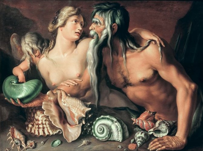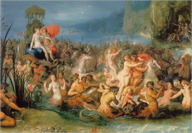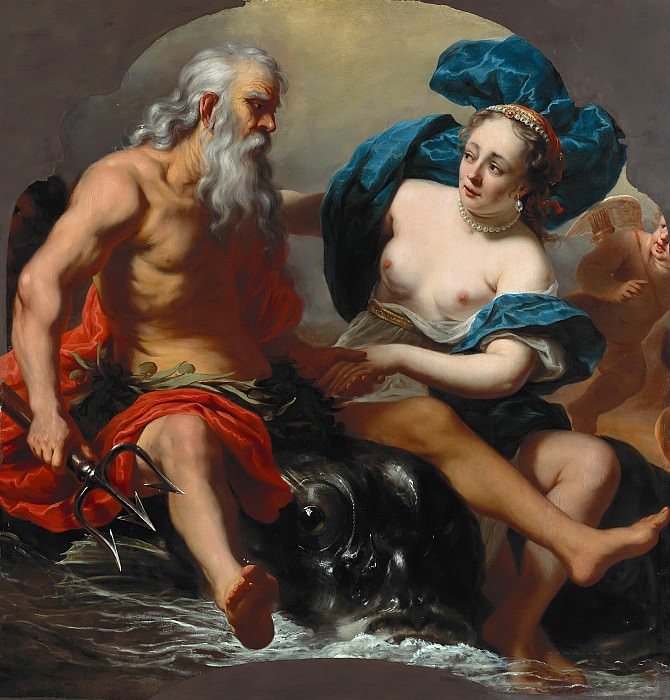 の絵の中で フェルディナンド・ボール著 は、ネプチューンとアンフィトリテという神々しいカップルを描いています。女神はポセイドン・トリトンなどの子神を産み、イルカなどの海の生き物も産んだ。