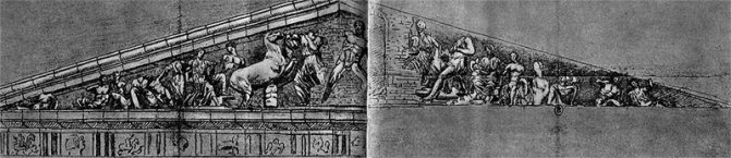 パルテノン神殿の西側ペディメント。ジャレイ・キャリーによるスケッチ。パリ国立図書館