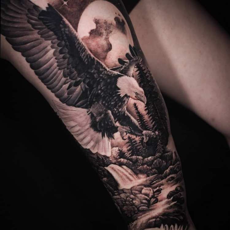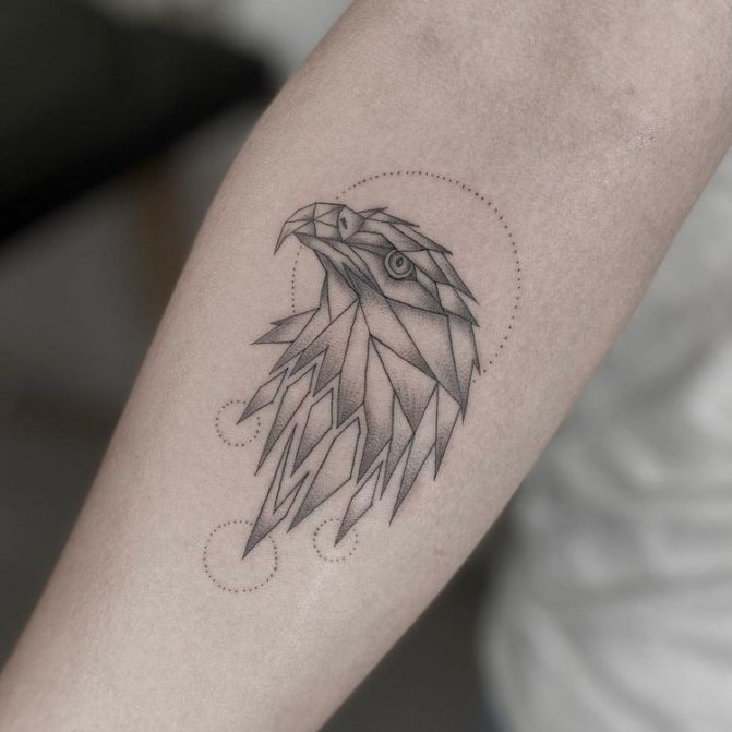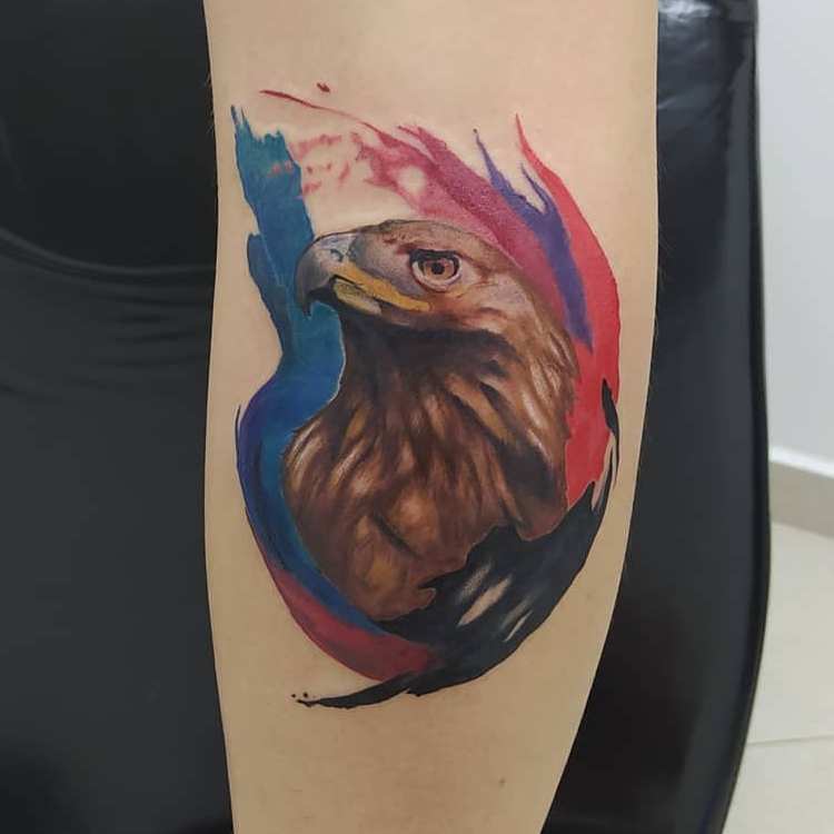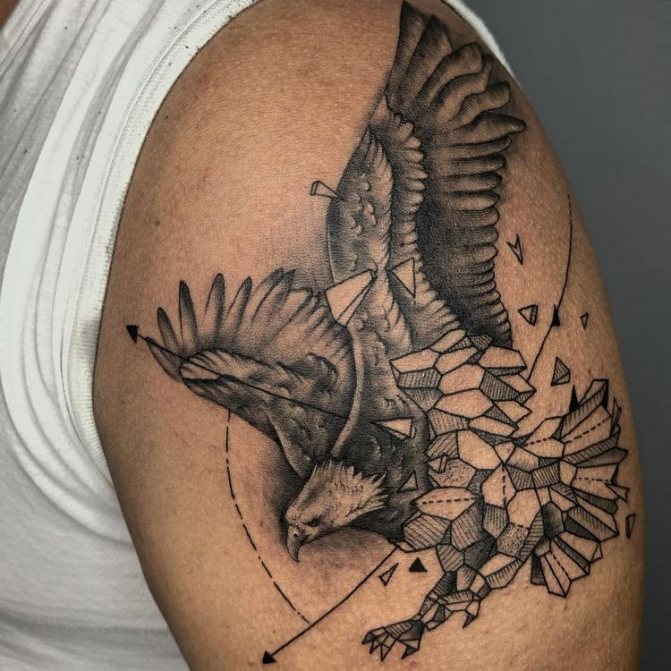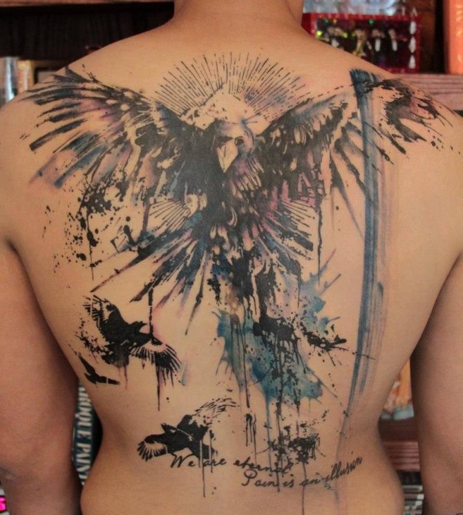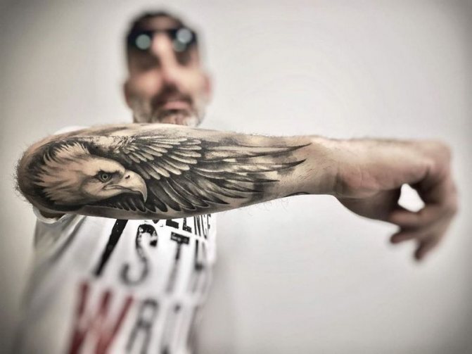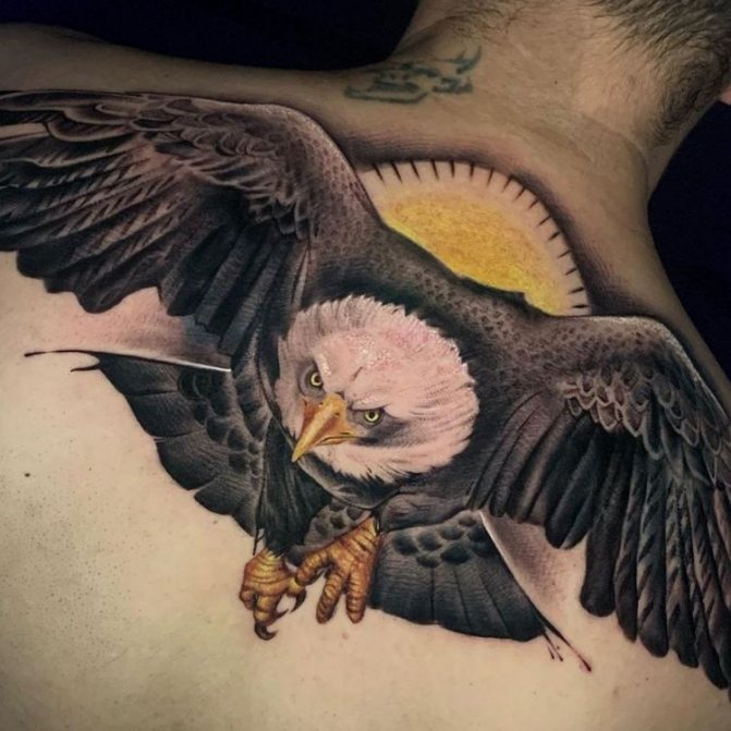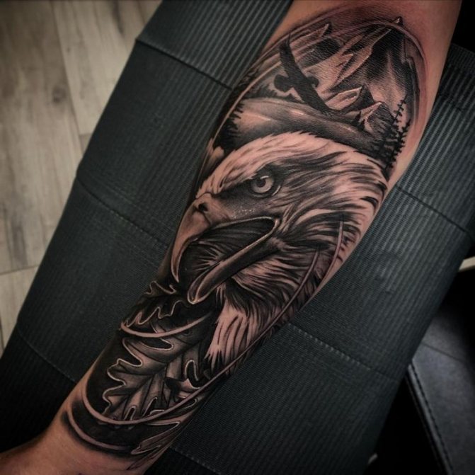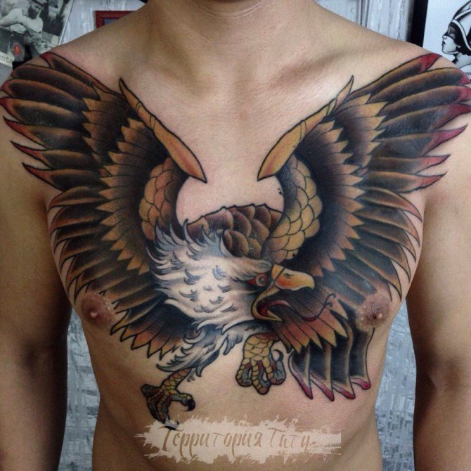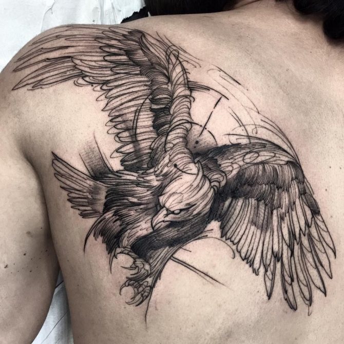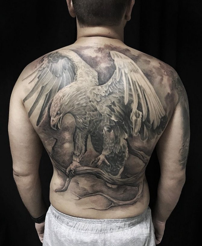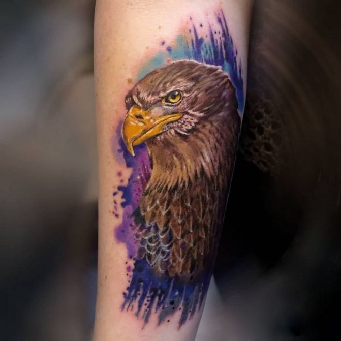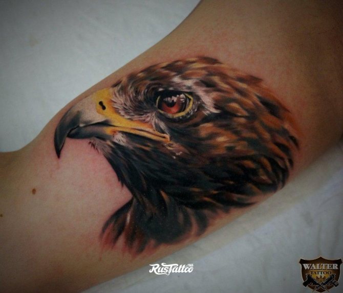 タトゥーの分野での対象は、選択したスタイルに直接依存します。Graphicを使用する場合、印象的な画像は技術的に使用することができません。特に、戦場を飛ぶ鷲や、十字架の形をした巨大な墓石に鎮座する鷲などである。また、水彩画のスタイルで、山を背景に獲物をくわえた鳥が描かれている。