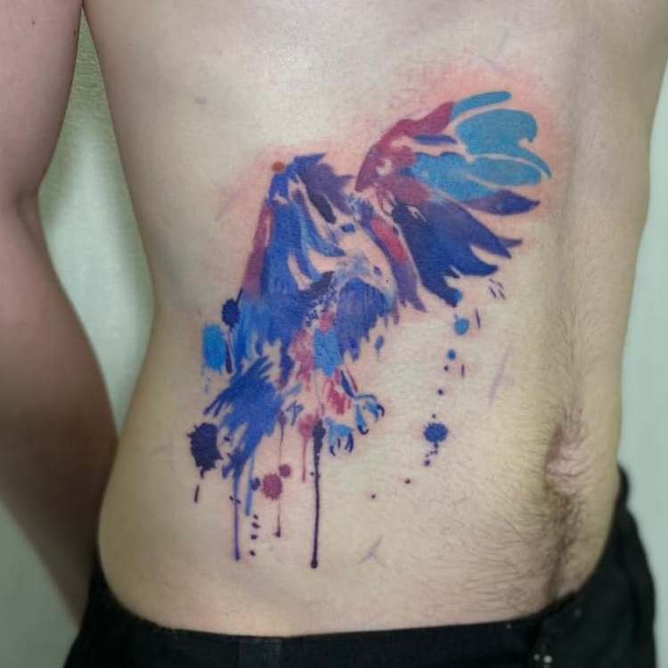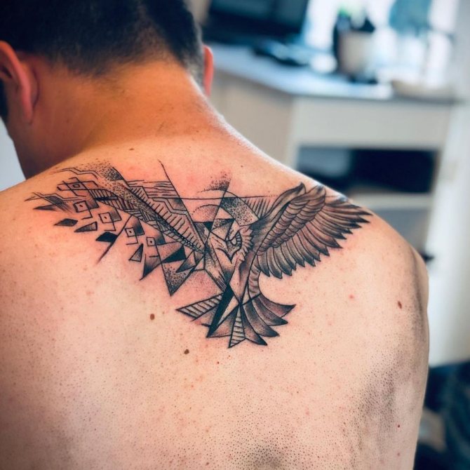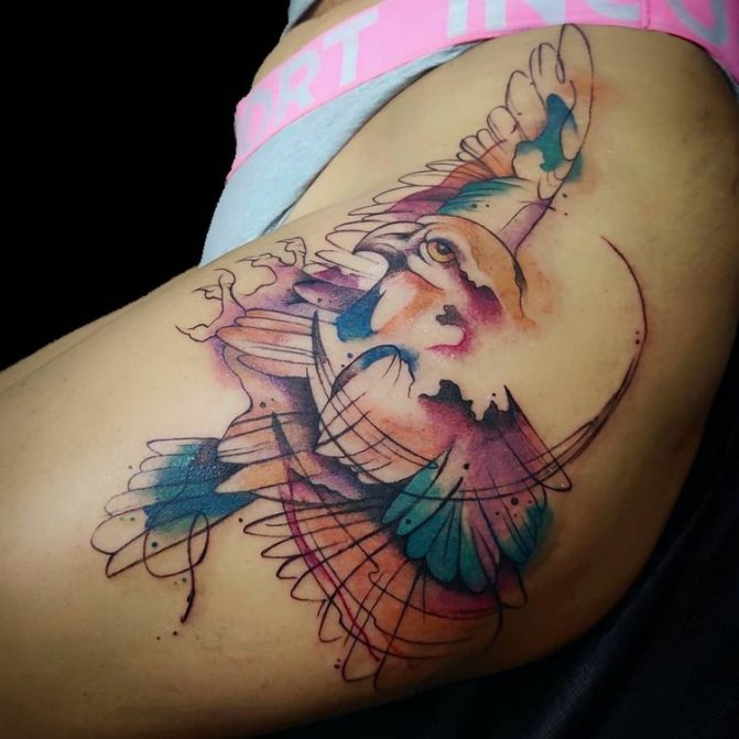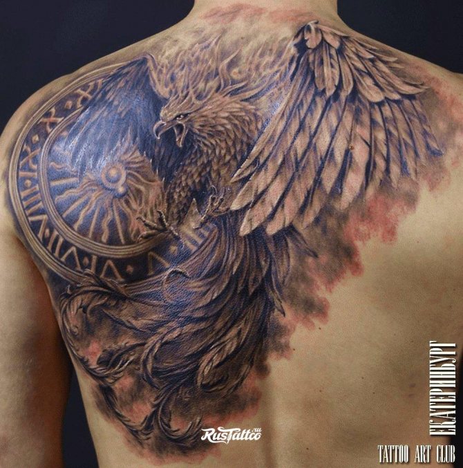 このキャラクターは男性だけでなく、女性にも備わっている。鷲のイメージを自分の皮膚に適用することに大きな意欲を持ち、カラフルで大規模なスケッチを選択する。翼を広げたこの鳥には、胸や背中が最適な場所です。
