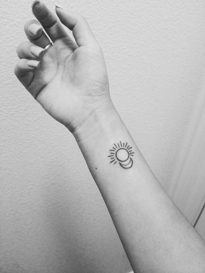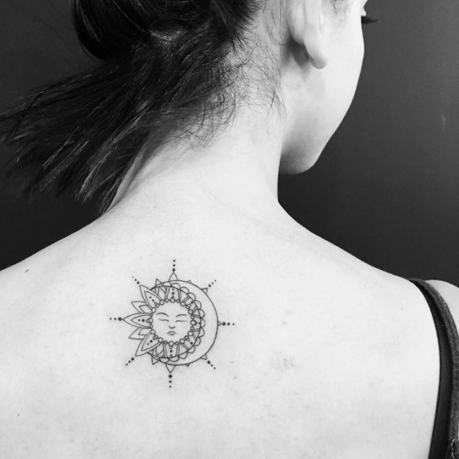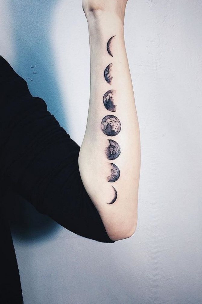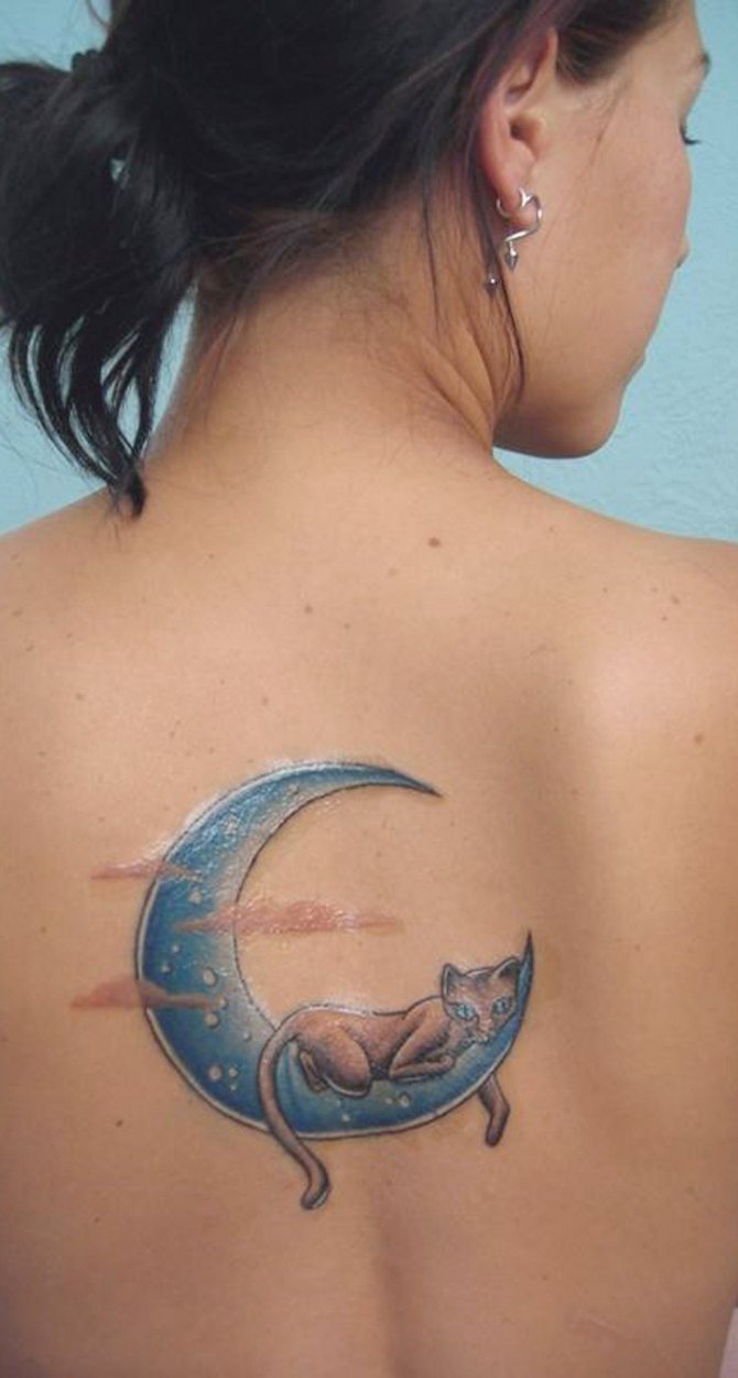 例えば、月を背にした一匹狼は、男の背中によく似合う. そして、月を背景にした猫の小さな絵が、女性の手首を飾っています。このようなタトゥーは、モノクロで行うのがベストです。上半身は月のタトゥーにも適しています。