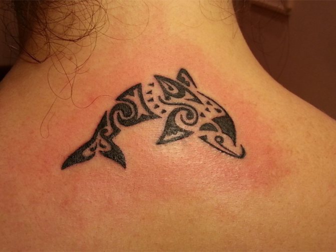 このようなドローイングを行う場合、異なる複雑な形状、スパイラル、できれば黒が使われます。この場合のドルフィンは、アウトラインとシンボルの形で描かれています。