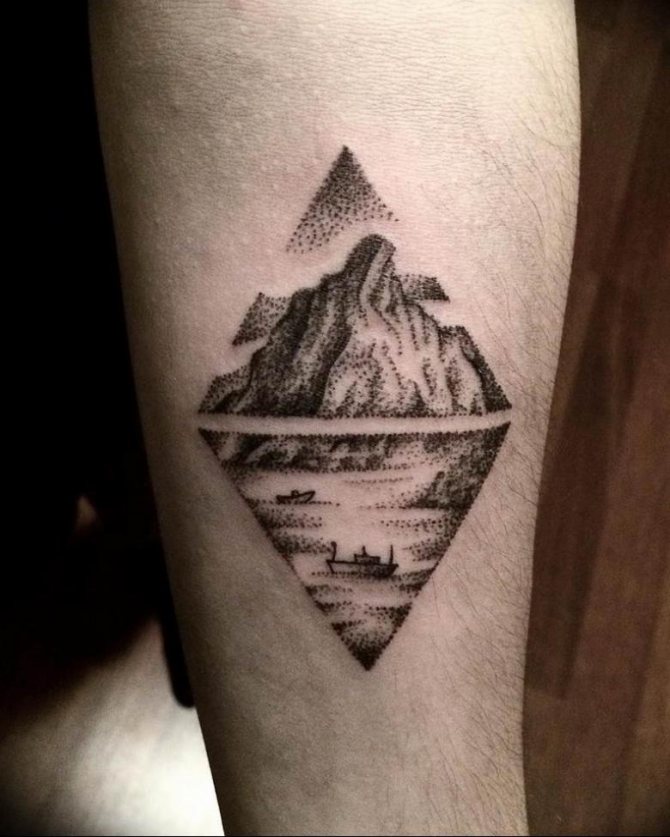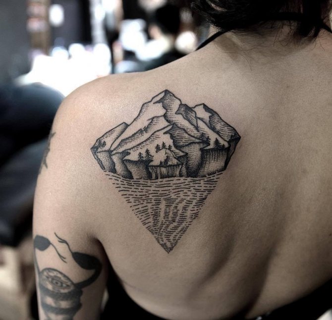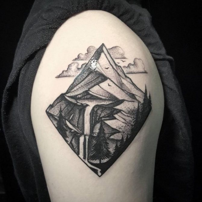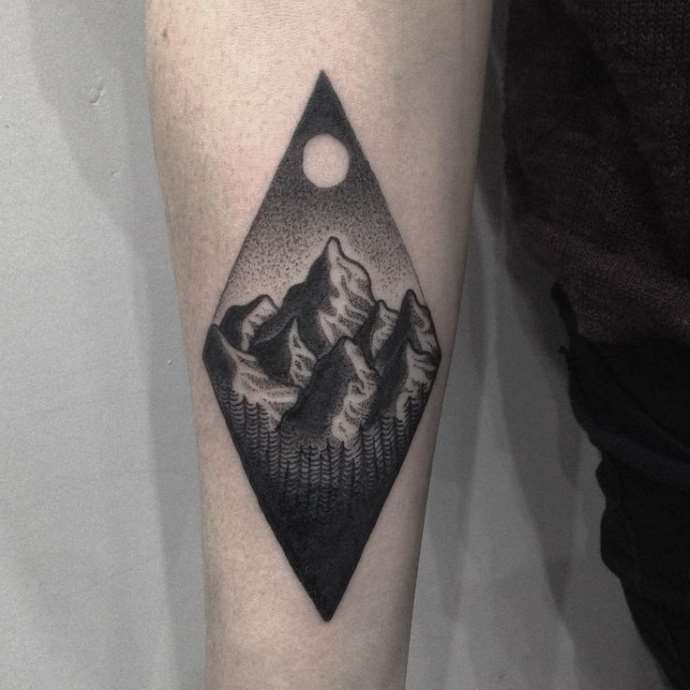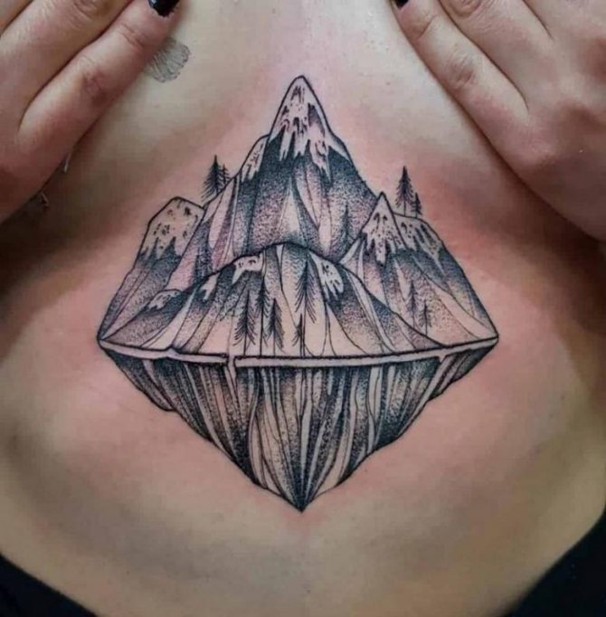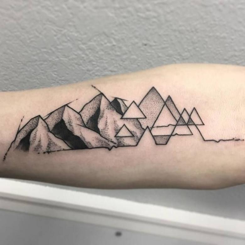 ある人は、山のタトゥーは人生の最も奥深い知恵をつかんだ賢者の証だという。オカルティストにとって、山は力のある場所を意味し、双子の山-生と死の闘い、太陽と月、光と闇という異なる原理の統一-を意味するようになる。