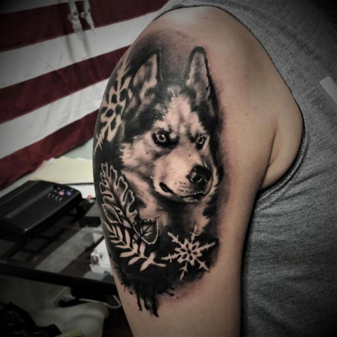 ハスキーは、忍耐力、大胆不敵、信頼性、勇気のシンボルとして登場します。このイメージのタトゥーは、お守りになるような男性に適しています。