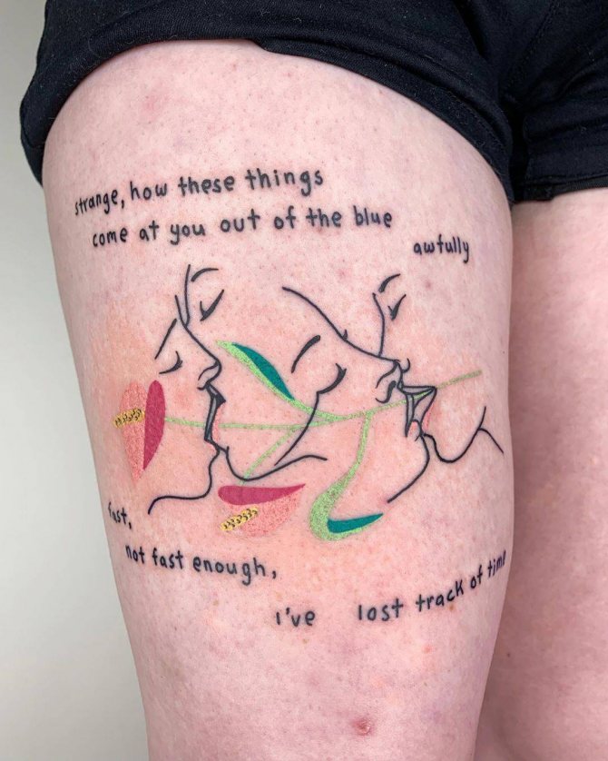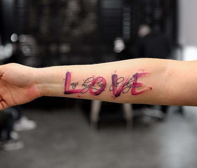 愛の言葉を刻むタトゥーは、ボディペインティングの芸術における最も人気のある現代的なトレンドの一つです。タトゥーの碑文は、しばしば賢人、作家の表現、文学作品からの引用、愛についてのことわざや格言、主題に関する人気のある歌の言葉を選択します。多くの場合、英語、フランス語、アラビア語、日本語の複雑な文字が選ばれています。