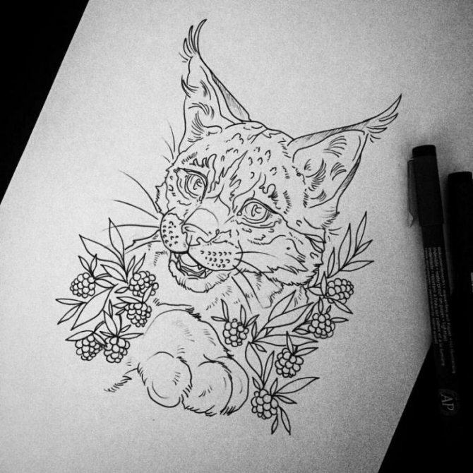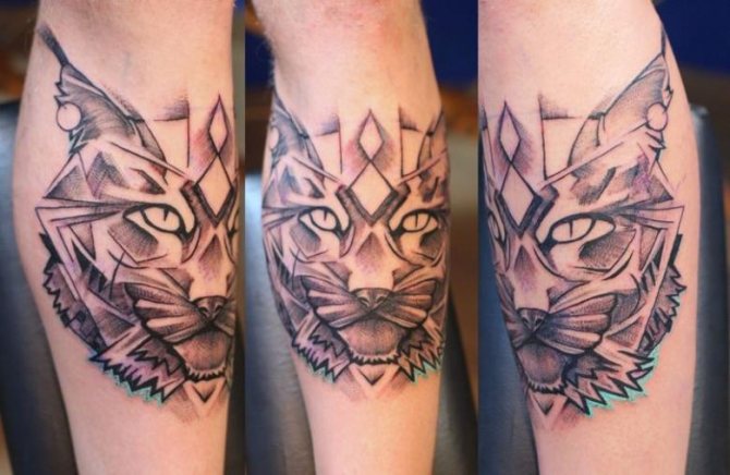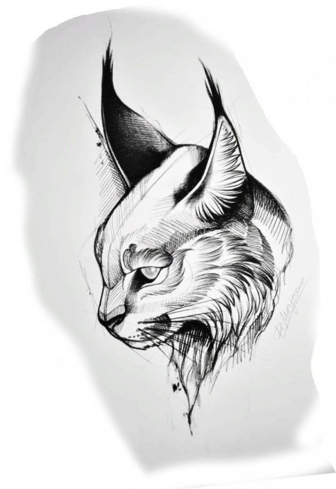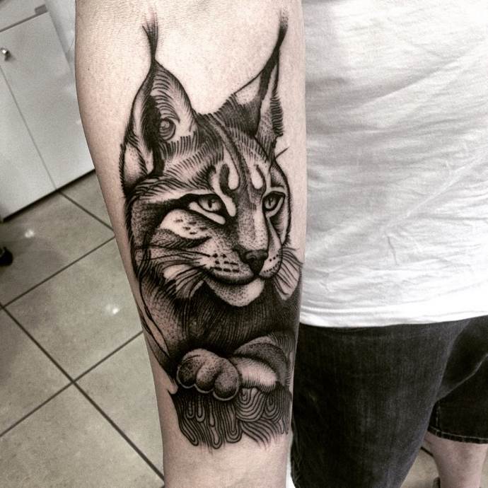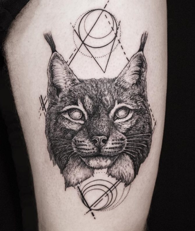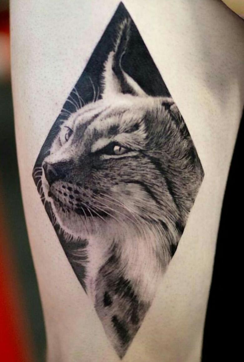 リンクスのタトゥーオプション オオヤマネコのタトゥーは、白黒とカラーの両方が適用されます。 このような画像のスタイリングは様々です。. オオヤマネコは写実的なスタイルが多いが、ポリネシアやケルトのスタイルもよく使われる。主な適用場所。