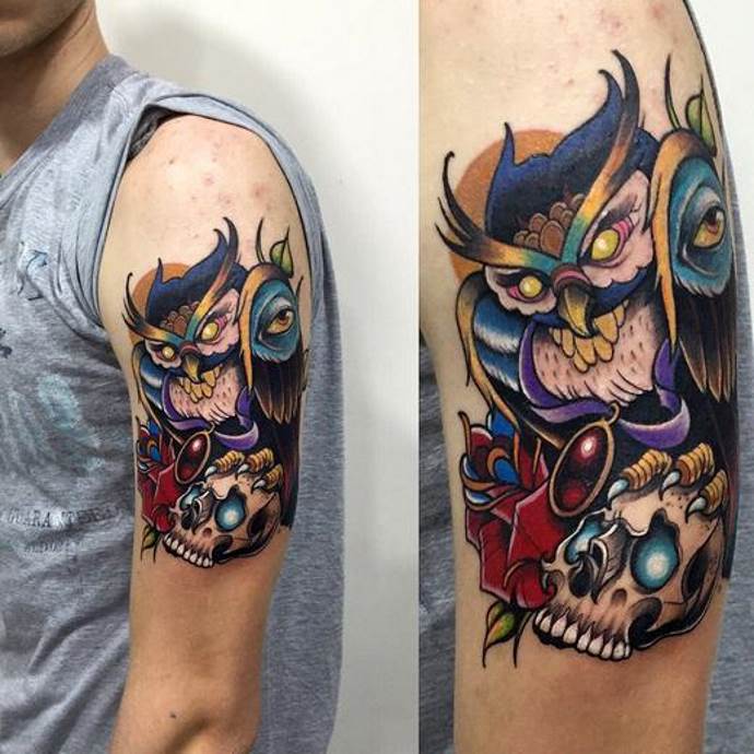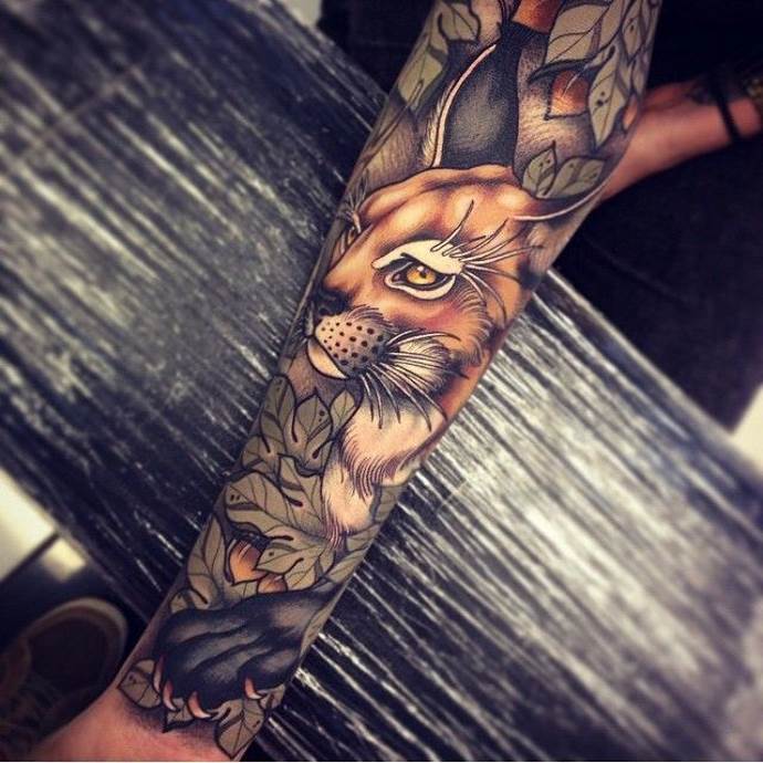 面白くて明るい見た目の新しいスクール・スタイル・タトゥー。oldskul、しかしoldskul多くはプリミティブを非難し、newskulこれは明らかにそうではありません - このスタイルは、彼の兄の機能の一部を採用しています。その利点は、規範から出発し、任意の画像を独自のスタイルで考え出すことが非常に可能であるという事実にもある、珍しい色でそれを描く、動物の漫画のキャラクターや擬人化を与える。様々な装飾が施されていることが多い。例えば、バラや頭飾り、宝石で縁取られたフレームにオオヤマネコの肖像画を配置。