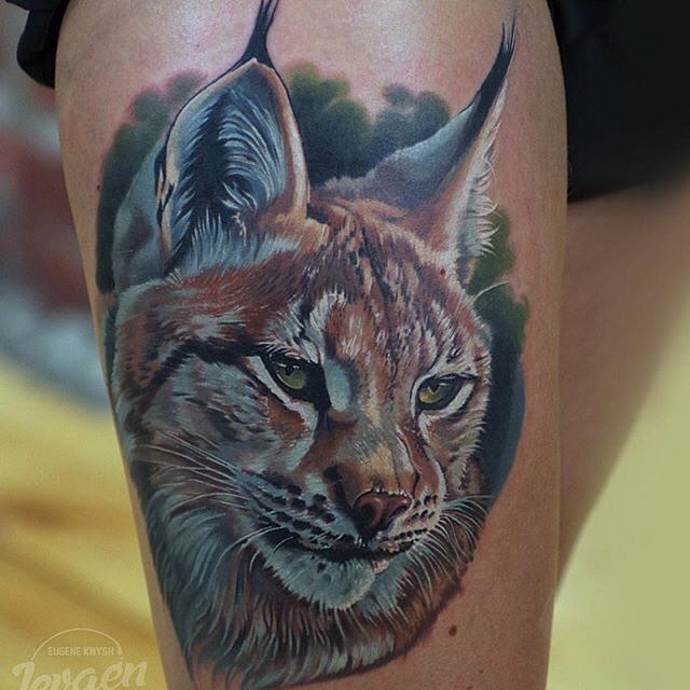 大山猫のタトゥーは手に入れることが多いのですが、スペースがないためできない場合もあります。この場合、別の部位を使用します。タトゥーを隠したいのか、目立つ場所に作りたいのか、すべてはその目的次第です。太ももは、オオヤマネコが着用者の不屈の精神、スピード、強さを象徴するため、メイン部位と考えられています。