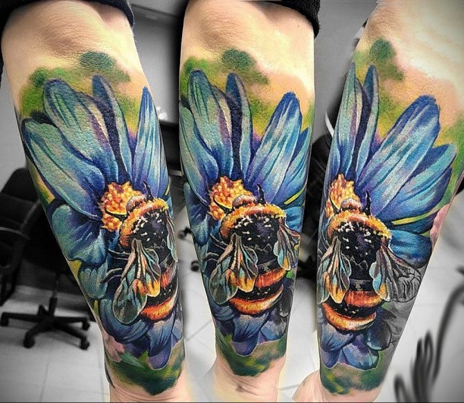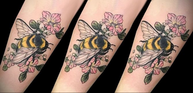 マルハナバチの体は黒と黄色の縞模様で飾られているため、タトゥーのデザインは通常カラーで行われる。この方法で、生き物の美しさを表現しています。タトゥーは、赤、緑など、異なる色で補完されることが多い。これらは、昆虫の生息環境を示す背景として使用されています。