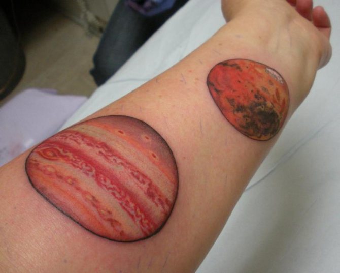 木星のスケッチは、細部、明確な描画、多くの小さな要素の存在によって特徴付けられるリアリズムのスタイルで行うことができます。このような構図は、大きなスケールで行わなければ、タトゥーがぼやけてしまい、あまり美しくありません。