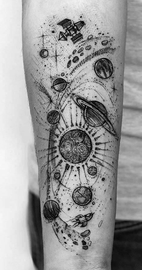 上肢は、小さなコンポジションから大きなコンポジションまで置くのに適しています。手首は、小さな星に囲まれた惑星やUFOなどのミニマルな略図を描くのに適しています。手首と肘の間には、空を背景に月と対になる太陽を刻むことができ、また背景なしでも可能です。手首のスペースは常に目に入りますが、タトゥーの入った袖は、必要に応じて衣服の下にうまく隠すことができます。