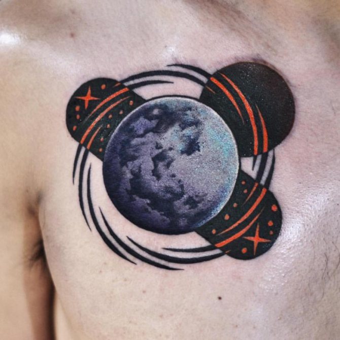 月は、すべてのタトゥーの中で最も男性的なものです。この惑星は、男性らしさ、強さと関連しています。若い男性は、勇気、体力、大胆さなどの資質を強調するために刺青を入れます。
