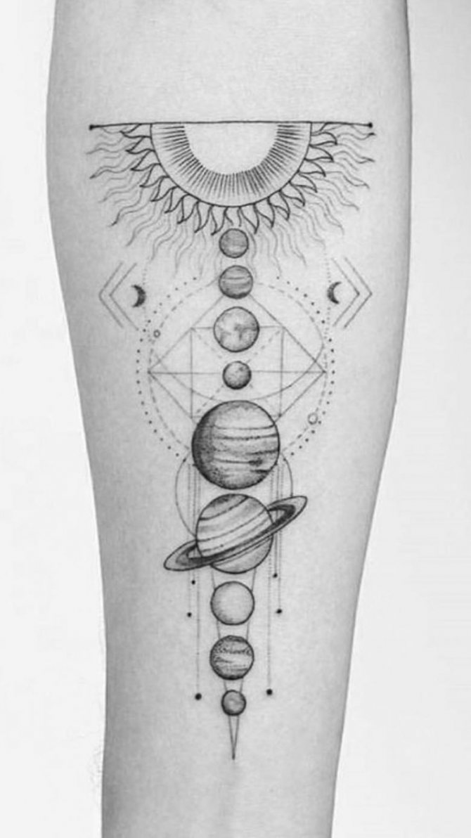 並べて配置された惑星は、独自の世界観を持つ多才な人たちを表しています。このタトゥーは、世界観の多段階の形成、人間の精神的な成長、現実を認識する方法の多様性を象徴しています。