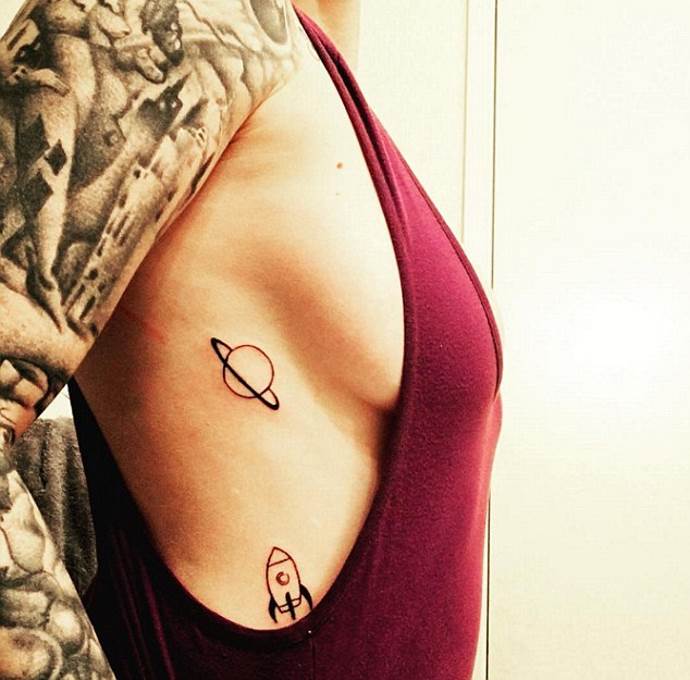 このタイプのタトゥーは、女性よりもむしろ男性が選ぶものですが、華やかな絵は通常、服の下に隠れます。だからこのあたりは、タトゥーで傷ついた体に、星が散らばる宇宙の風景や惑星をクローズアップして、ギザギザに流れるように描いた、珍しいスケッチを選ぶといいかもしれませんね。