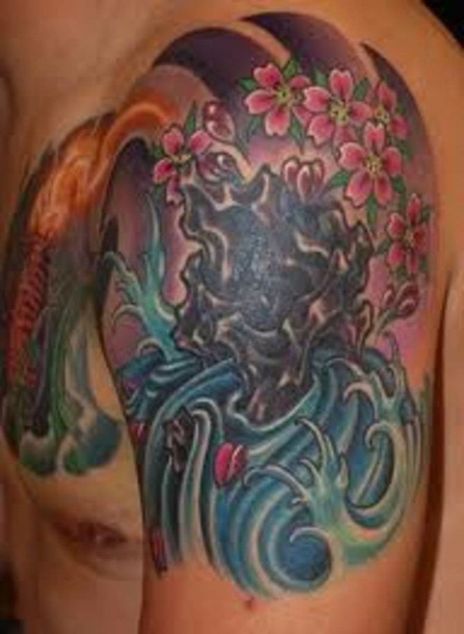 肩や後頭部の波のイメージは、絶え間ない自己啓発、完璧を求める気持ち、多くの知識や技術を習得しようとする気持ちの象徴です。タトゥーのオーナーは通常、豊富な人生経験を持っているか、それを目指しているため、どんなことでも洞察に満ちたアドバイスをすることができます。常に動いている波の変わりやすさは、地球上に永遠に続くものはなく、私たちを取り巻く世界は刻々と変化しており、学ぶのに遅すぎるということはないのだということを教えてくれます。