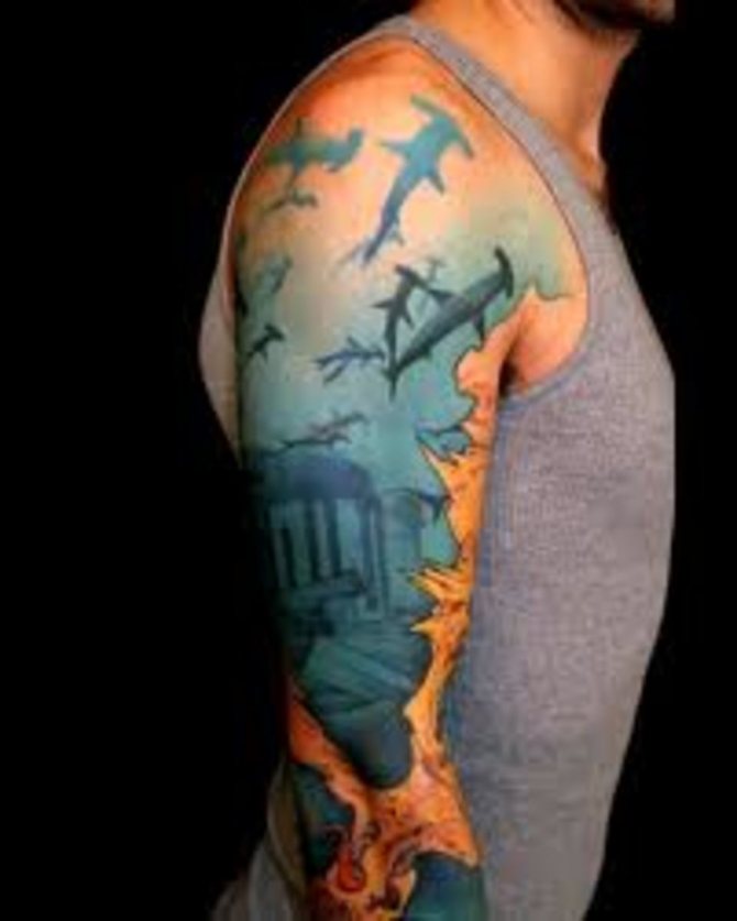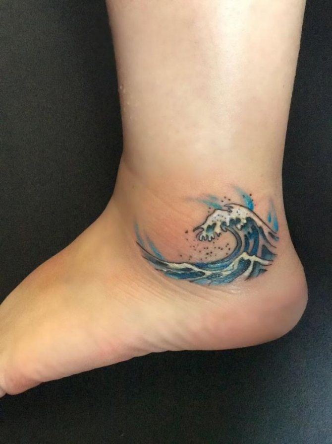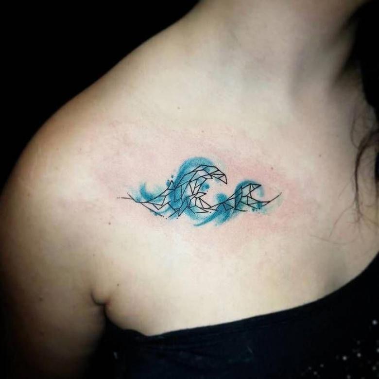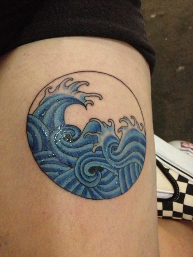 金色の砂や夕焼けの空を背景にターコイズブルーの波が色合いを変える鮮やかな色のタトゥーは、旅行や他の国の自然を発見するのが好きな女の子にアピールするものです。身近にあるもの、観察して学びたいという気持ちから、ブーメランの法則、カルマの存在を信じる人が多い。ウェーブタトゥーは、水の流れが互いに流れ込み、新しい形を生み出すように、ある人の行いが他の人の状態に影響を与えることを意味しています。