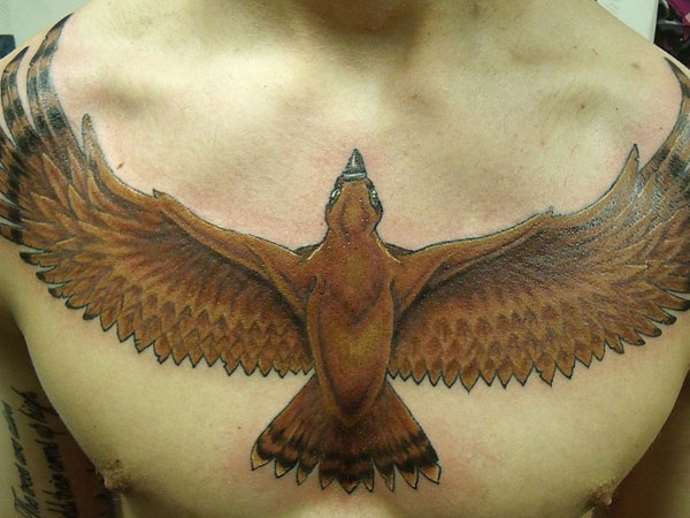 - 翼を広げた鳥は、自由と不屈の精神の象徴であり、あたかも男性が束縛から解放されたと言うかのようです。