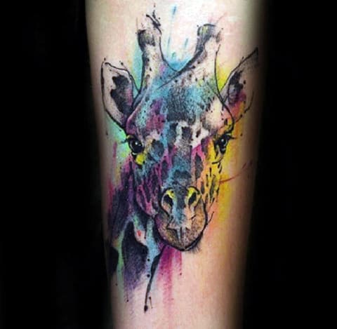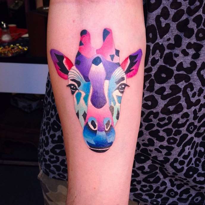 水彩画を絵画として語るとき、そこにはグラフィック的な要素が内在しています。この特徴は、タトゥーにも採用されています。多くの場合、色の移り変わりだけでなく、かなり細いとはいえ、はっきりとした黒のアウトラインで描かれます。鮮やかな色彩と飛沫が、作品にオリジナリティと官能性を添えています。特にこのスタイルでよくできているのは、キリンのペア、母親と子供の画像です。
