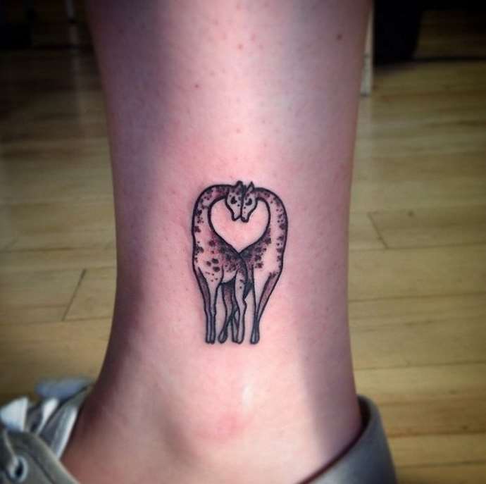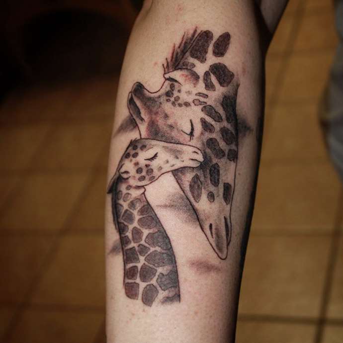 水場に動物がいることは、その人が不死身で、何も怖くないと感じることを意味します。2頭のキリンと1頭の子供のイメージは、家族の価値への敬愛を表しています。このようなタトゥーの持ち主は、家族と彼らへの配慮を人生の第一に考えています。キリンの入れ墨は、寛大で、親切で、フレンドリーな男性に適しています。