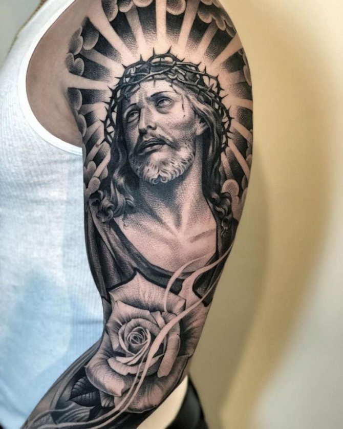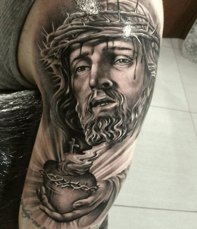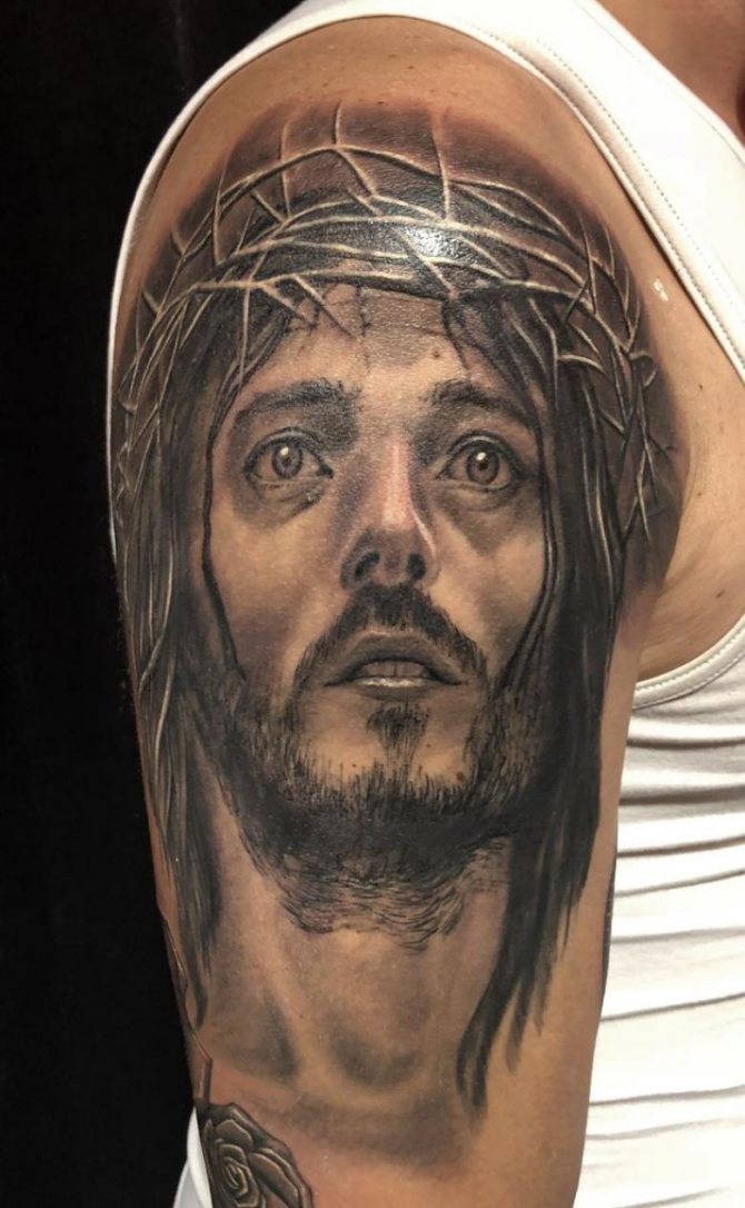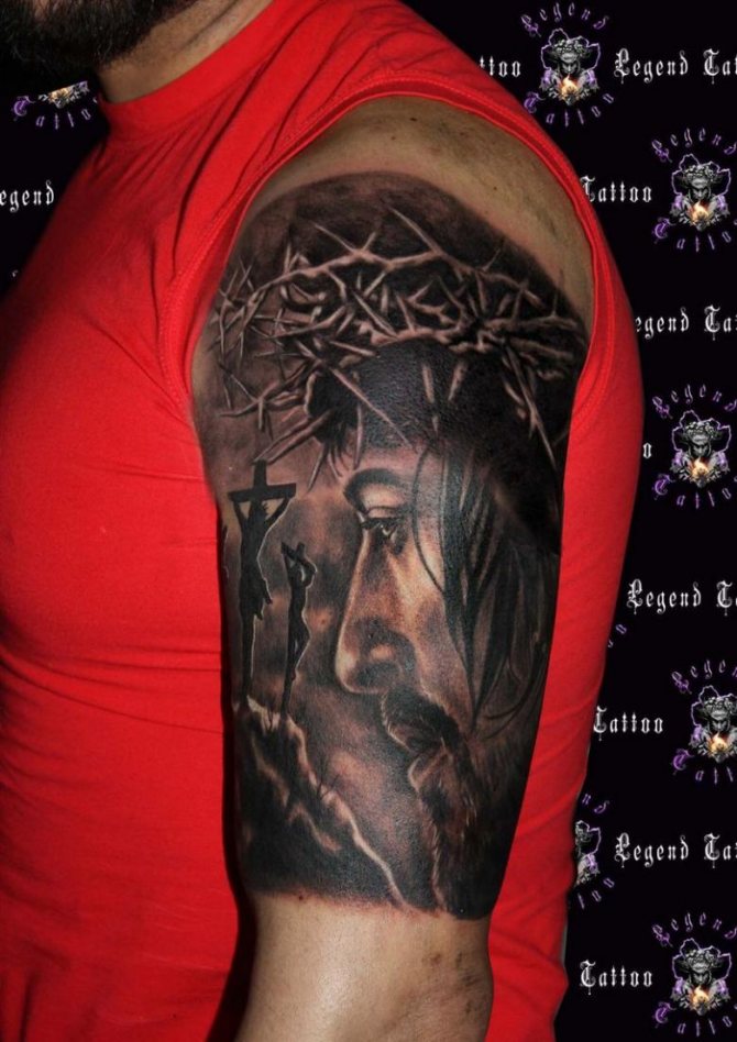 神々しい顔で自分自身を飾るには、精神的な方向性が自分たちに引き起こされた悪を許すのに役立つ、より強い性別の勇敢な代表者を好む。男性のタトゥーは、キャラクターの茨の冠の下に赤い血の滴があるため、女性よりもリアルに見えます。