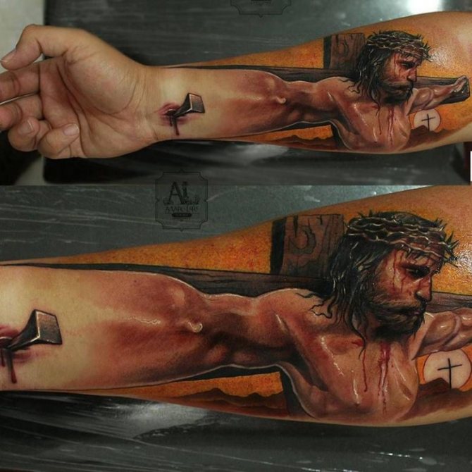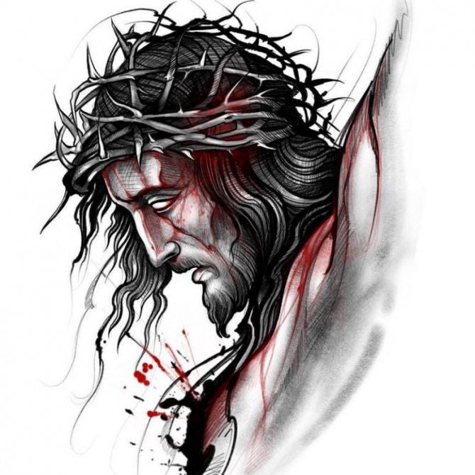 キリストの苦悩を描いたスケッチ画には特別な意味があり、刺青の持ち主にとっては、主の苦悩を共有する象徴的な方法なのです。したがって、信仰と多感な人々は、これらの画像に特に注意深いですボディ。