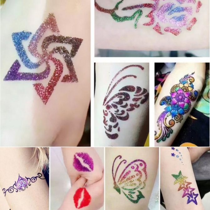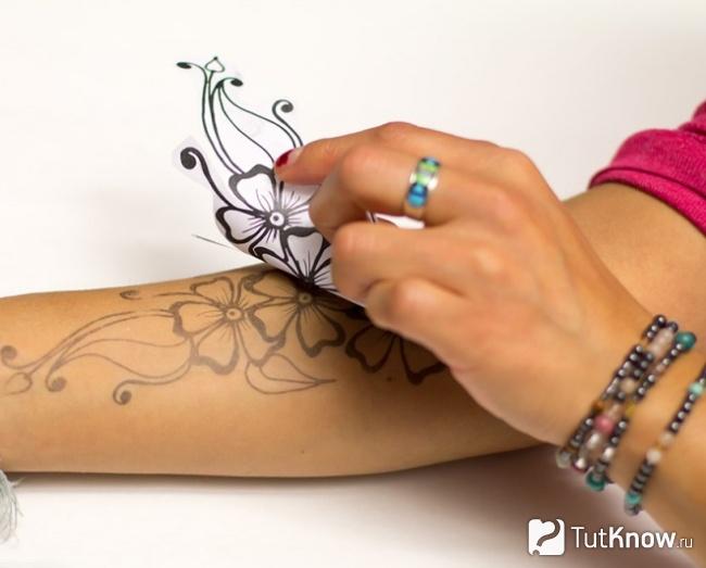 テンポラリータトゥー - 本物のタトゥーのように見えるステンシルの方法。黒色の油性マーカーで、ステンシルを通して、非常にリアルな刺青を施すことができます。既成のステンシルを使ってもいいし、自分で切り抜いてもいい。紙に絵を描いて、ハサミやペンナイフで切り取ることで行われます。