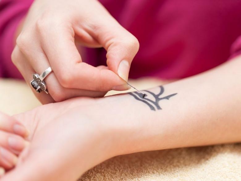 - 3ヶ月のタトゥーも針を使いますが、穿刺の深さは浅くなります。この方法の欠点は、インクが溶けたときに皮膚の下に醜いシミができることである。それを隠す必要があるため、処置を繰り返さなければならない。
