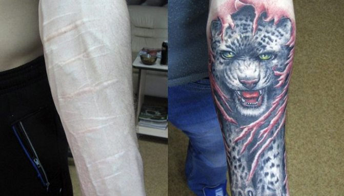 - 肥大化する。繊維組織の急速な成長による深刻な皮膚損傷の結果として残ります。術後の縫合痕によく似ており、赤味や濃いピンク色を帯びています。多くの場合、傷のある部分は痛みやかゆみを伴います。これらのマークを重ねることは可能ですが、医師とプロのタトゥーアーティストに相談した上で、注意してください。