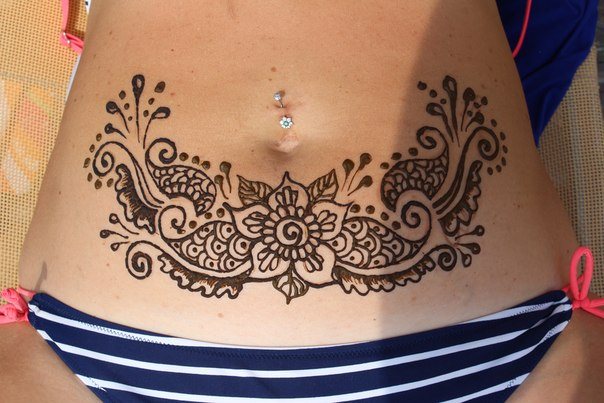 パターン さまざまな模様で体を飾るのは、どの国でも行われていることです。アラビアやインドの美しい装飾品に見える、北の民族の民間伝承を参照して、マヤの図面やファラオの墓から画像を使用します。出産後の腹部のタトゥーは、プロを行う場合は、古代のパターンは、有機的に現代の女の子のイメージに収まる。
