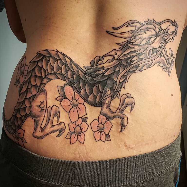 重要! 皮膚の色素を担うメラニンは、瘢痕組織には全く存在しない。そのため、腹部にはハイライトとシャドーのあるマルチカラーのタトゥーを入れるのがベストです。でも、やり過ぎないことが大切です。相性の良い色合いを4~5色使うだけで十分です。