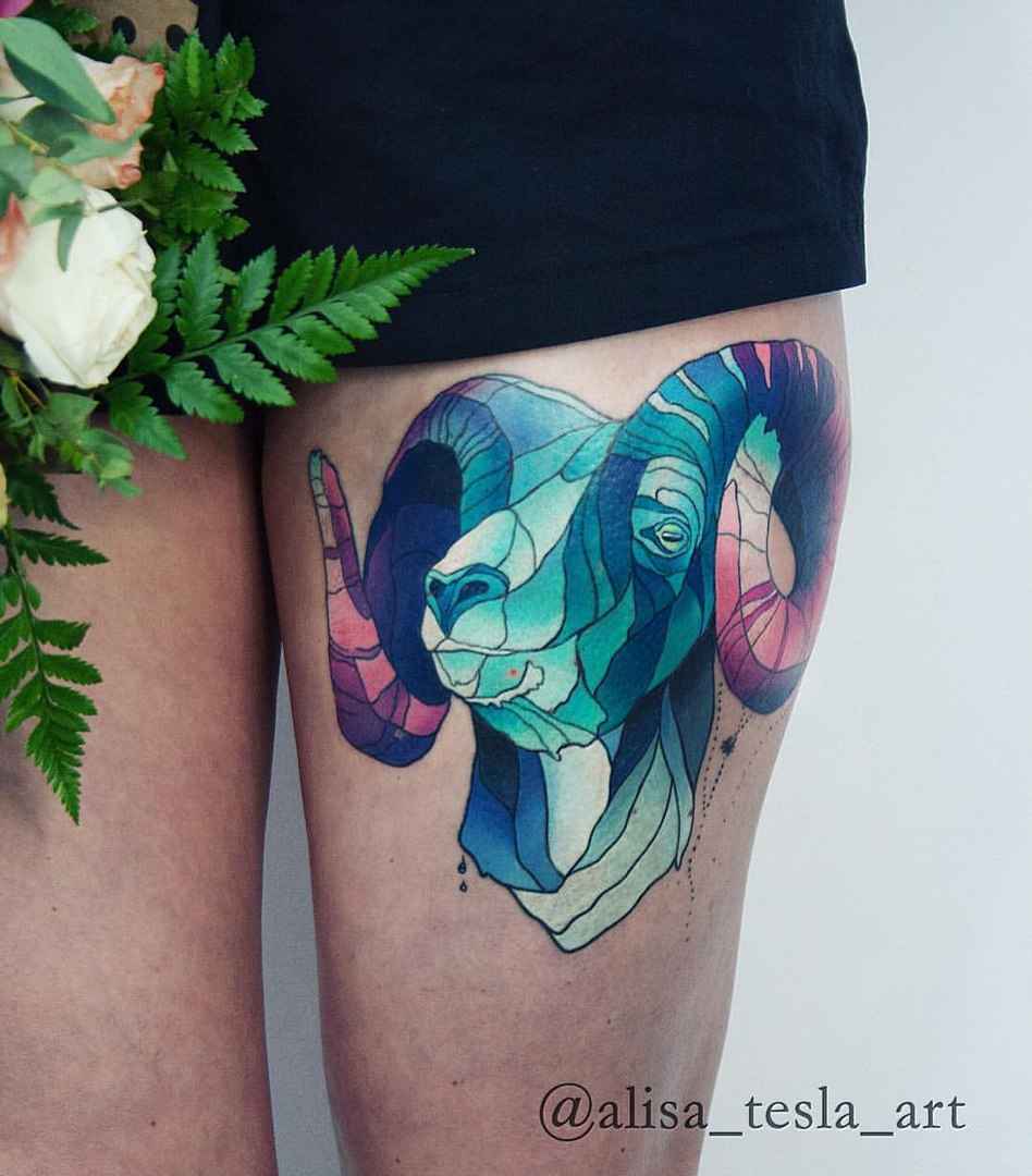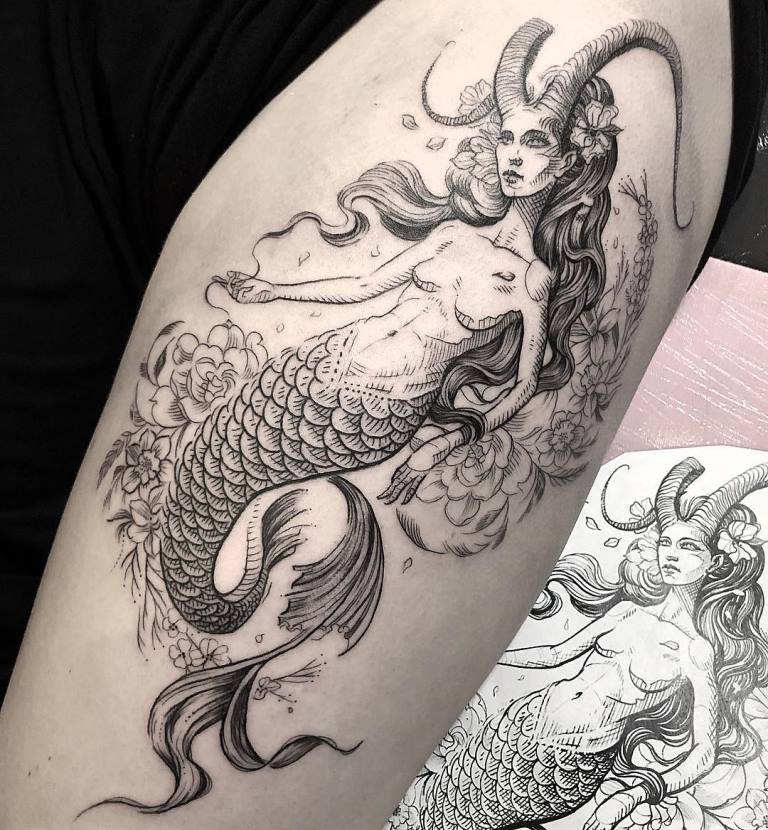 カラフルで色彩豊かなタトゥーに心を奪われたなら、水彩画やニュースカルプチャー、リアリズムに目を向けてデザインしてみましょう。抑制の効いたモノクロのイメージなら、ミニマリズムで。幾何学的な図形や他にはない抽象的な構図は、隠された神聖な意味を強調することでしょう。リタリングでは、渦巻きの有無にかかわらず、どんなサイズのタトゥーでも施すことができる。エスニックスタイルやジオメトリー技法でデザインされ、規則的な形と明確なラインの存在が特徴的な、非常にオリジナルなルックスのカプリコーンです。