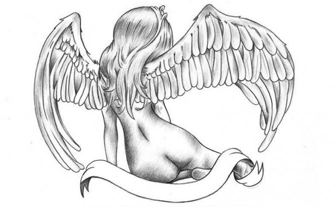 天使の女の子を描いたとても美しいスケッチがあります。どちらかというと、装飾的な意味合いが強いですね。このようなタトゥーは、男性でも女性でも喜んで入れることができます。