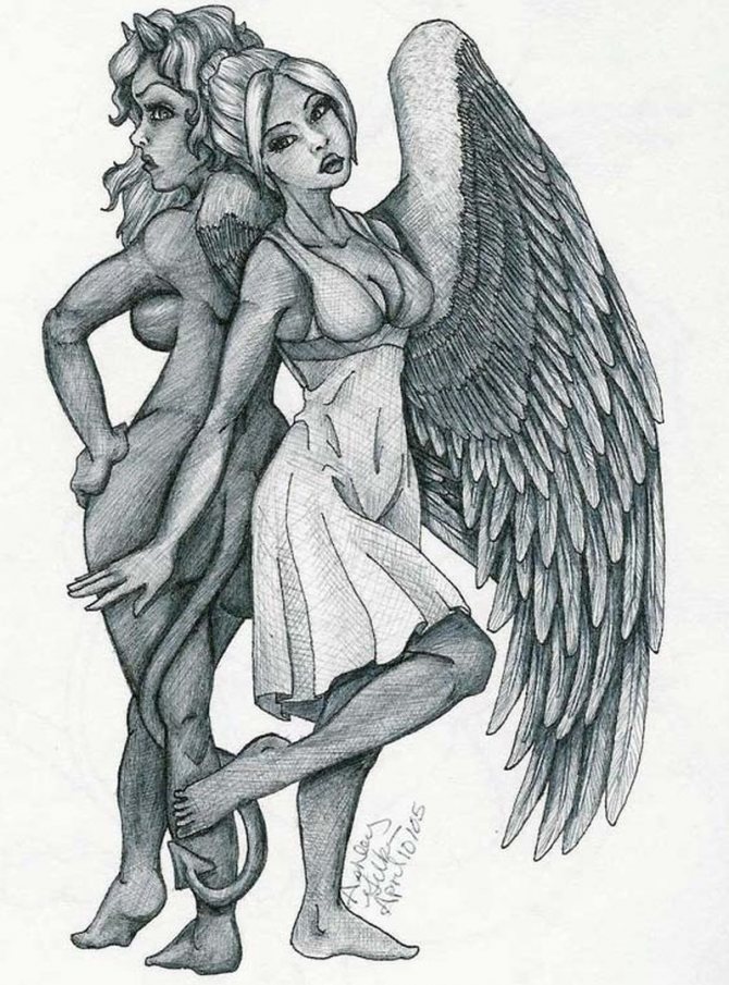 天使と悪魔のタトゥーは、人の中にある相反する力の闘争を解釈したものです。ほとんどの場合、男性に詰め込まれる。