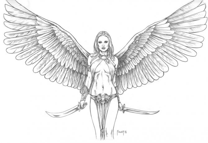注意! このスケッチの意味は、すべてポジティブなものではありません。例えば、翼が折れていたり、折れている場合は、恐怖や不満、深い不安などを表しています。