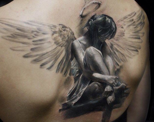 背中のタトゥー - 悲しい少女の形をした天使