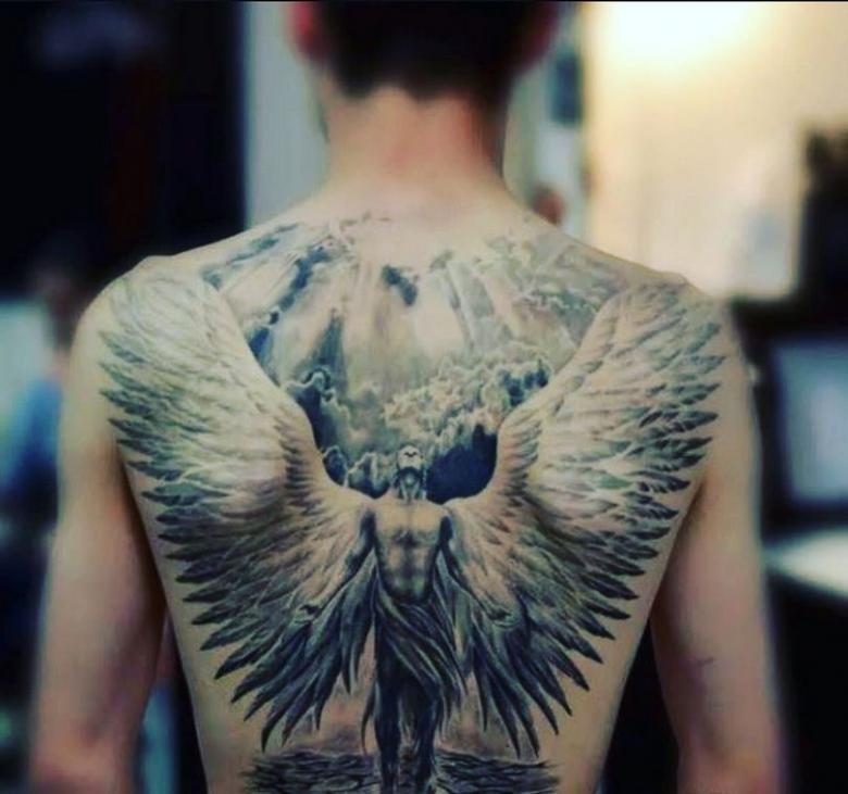 男の背中に彫られた堕天使の刺青。