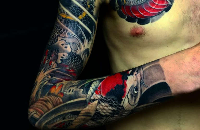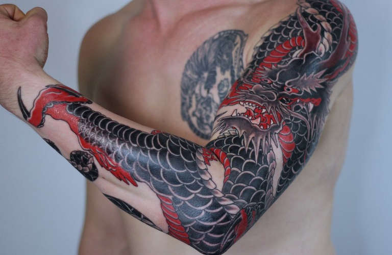 La manche n'est pas seulement un tatouage, c'est une composition artistique complète qui a une fonction démonstrative. Un homme aux croquis brutaux veut montrer ses forces, son leadership dans la vie, sa détermination et sa confiance en soi.
