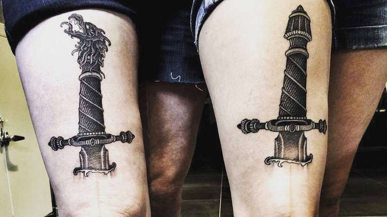 Les tatouages brutaux sur les cuisses suggèrent le tempérament, l'émotivité, voire l'agressivité d'un homme. Pour équilibrer le côté lumineux et le côté sombre, des êtres forts, mais équilibrés et sages, divers symboles peuvent être tatoués sur les cuisses.
